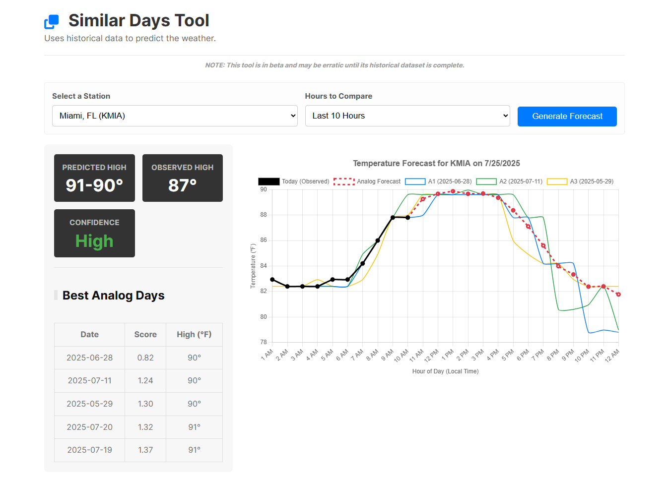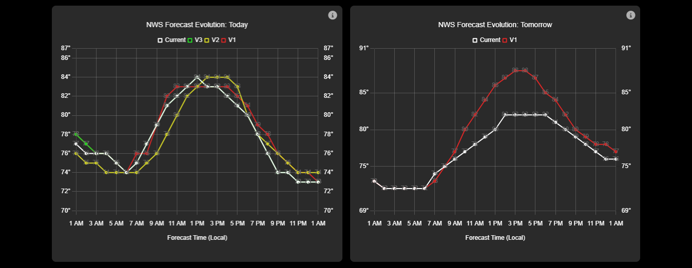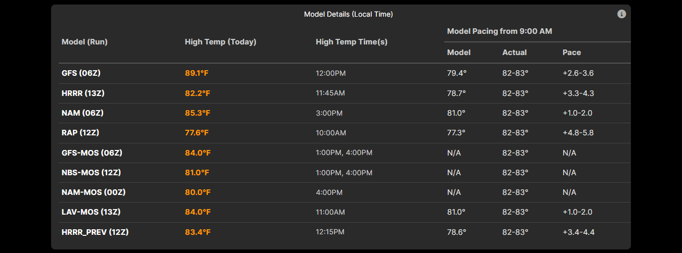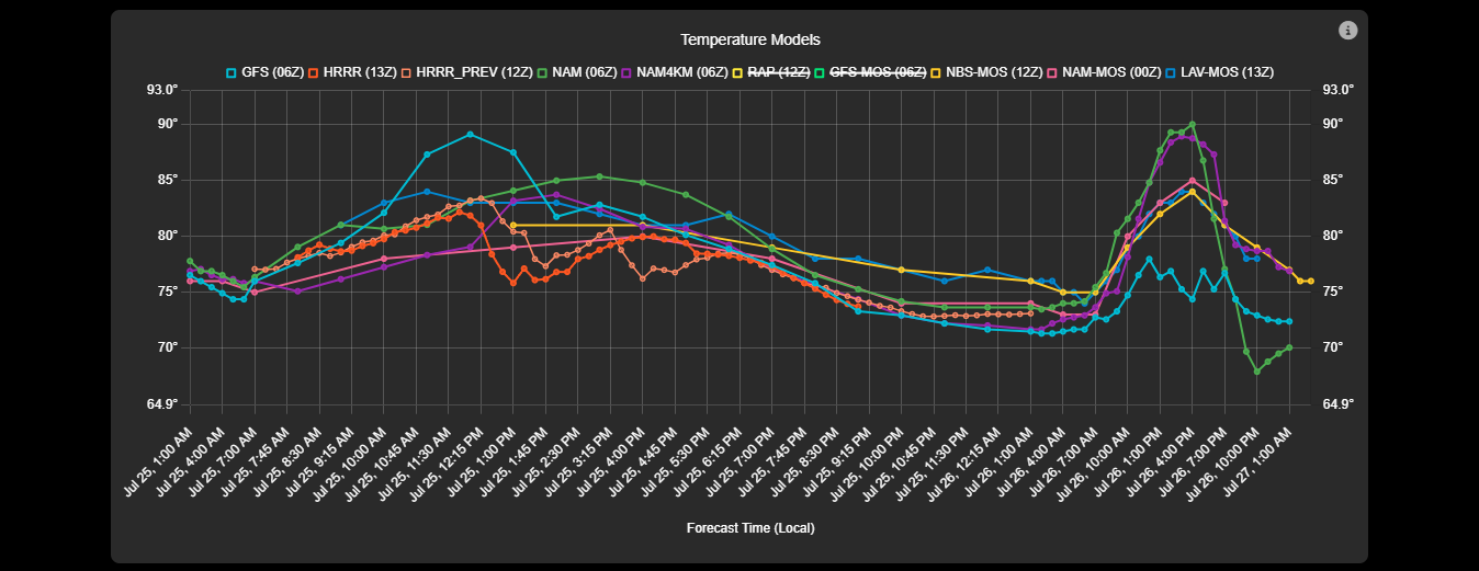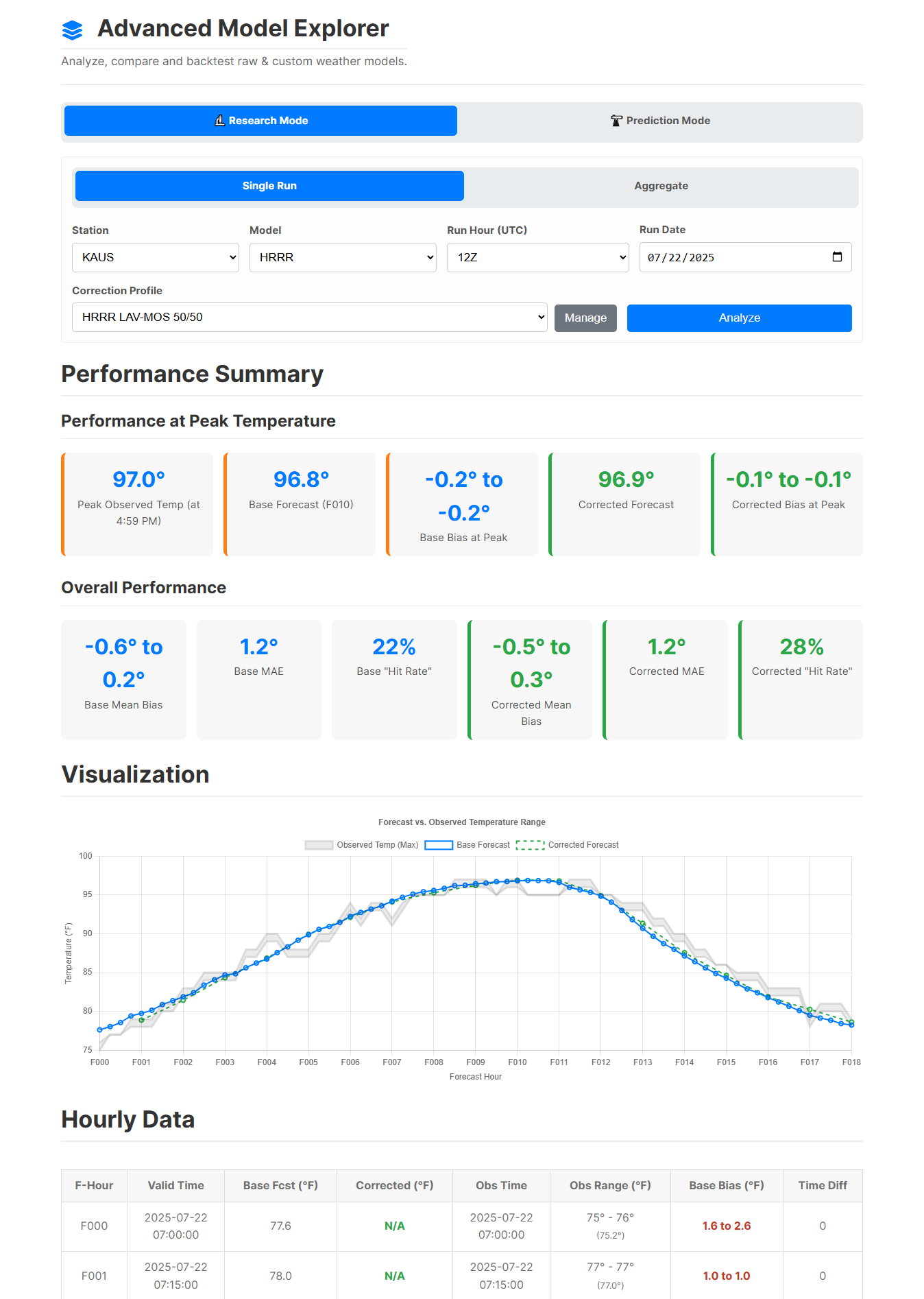 Analyze existing weather models by measuring their accuracy both generally and at the peak temperature of the day. Analyze a single day or backtest over a longer time period using Aggregate Mode.