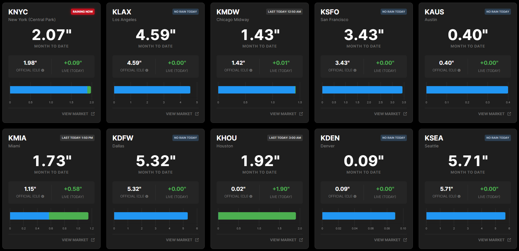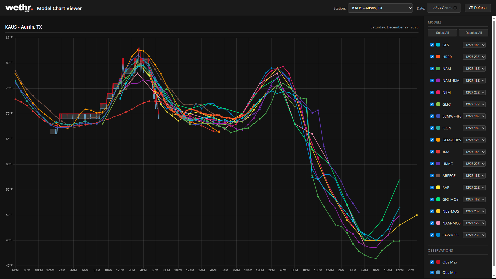 View key model data from regularly updated model runs, directly on the temperature dashboard. Data points for the current day include model high temps, model high of day times, and model pacing as compared to real-world observations.